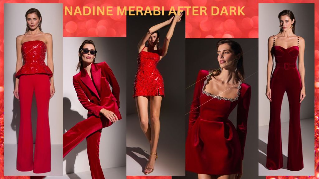 Nadine Merabi’s AFTER-DARK party season collection is red hot this season with a colour palette of deep reds and gilded golds. Designed to transform every