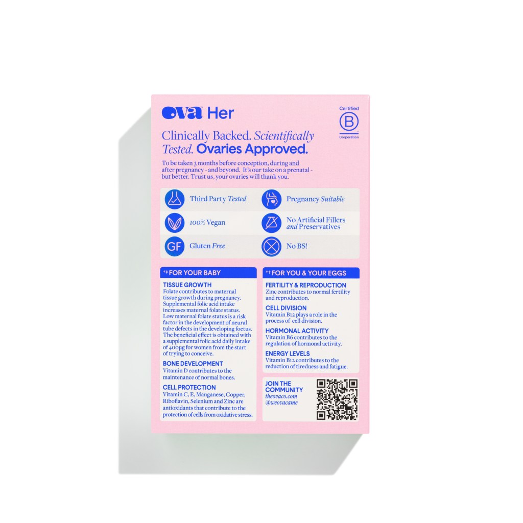 OVAHer Fertility & Pregnancy Support is a modern take on a prenatal – but better. Designed with 26 transformational nutrients such as Choline, Folate, high strength Vitamin D & Magnesium. It has been formulated to be taken in the 3 months leading up to trying to conceive or egg freezing to enhance egg quality and ovarian reserve, throughout all nine months of pregnancy to support implantation and baby’s foetal development, and postpartum to fast track hormonal recovery.