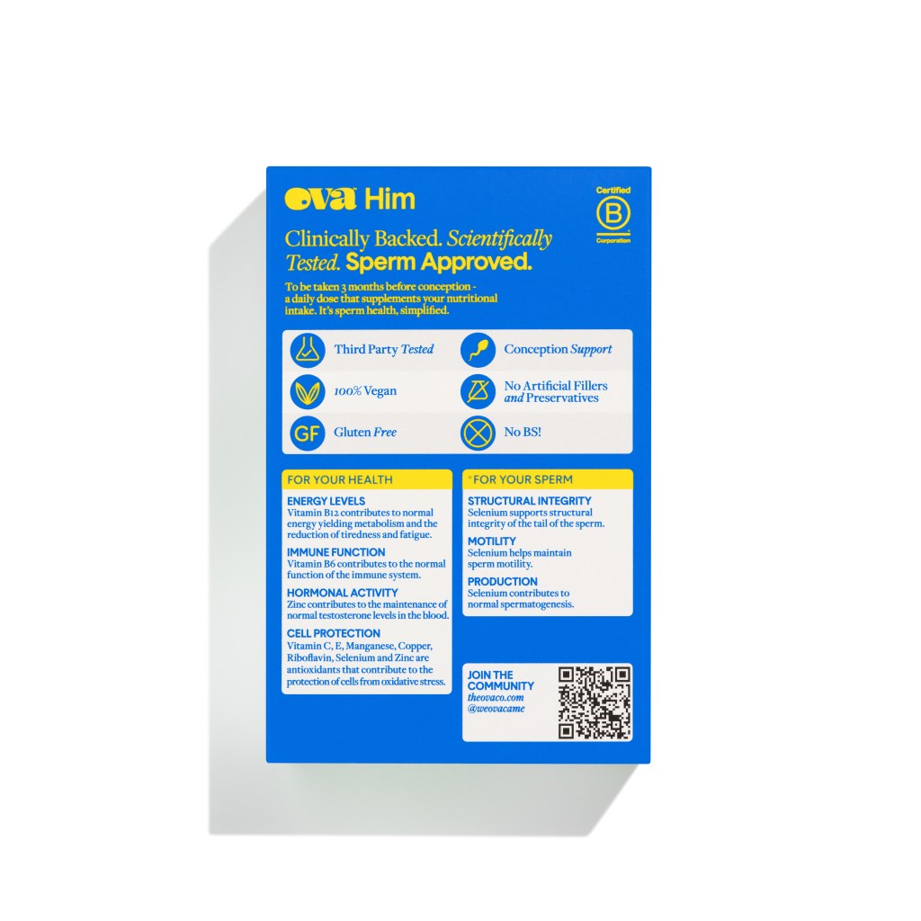 OVAHim Advanced Sperm Support is sperm health simplified, because trying to conceive can be a team sport. In addition to enhancing sperm motility (speed), count (volume) and morphology (shape), the 27 scientifically backed bioavailable nutrients also support energy levels, immune function and help maintain healthy testosterone levels.