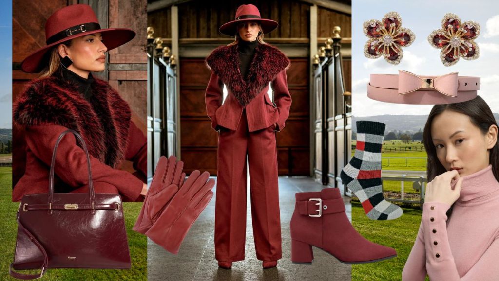 Coast x Lisa Tan Fur Trim Premium Jacket is part of a trouser suit in rich burgundy and a wool blend of 50% wool and 50% polyester. The jacket has additional wadding for insulation £110.00. Pair with matching Coast x Lisa Tan Wool Blend Trouser £74.00 Fedoras are a popular hat choice for the winter races and Coast x Lisa Tan Fedora With Contrast Band in a berry shade goes well with the trouser suit. Features a gold-tone snaffle detail for that equestrian touch £99.00. Add a touch of softness to the rich burgundy with Karen Millen’s Viscose Blend Roll Neck Knit Jumper in dusty pink or cream. Was £59.00 now £47.20 and The Seraphine Bow Belt by Lemon Daisy Accessories in light pink. Was £30.00 now £25.00 . Accessorise with Dune London’s ‘Define’ Leather Tote Bag in burgundy leather £169.00 and Paradox London’s Micro Suede ‘Aspen’ Mid Block Ankle Boot in burgundy. Also available in black and navy. Was £69.00 now £48.30. Keep those feet warm and toasty with Sock Snob’s 1 Pack Checkered Patterned Wool Blend Socks in burgundy. Designed to keep feet warm without being too bulky and heavy. The wool fibre traps warm air whilst the silk content allows the sock to become more lightweight. Also silk is incorporated into these socks to help them become more breathable. Were £9.99, now £7.59. Keep those hands warm with Snugrugs’ Butter Soft Leather Glove & Fleece Lining in dark red. Available in black, navy, brown and pink. Was £31.99 now £26.21 Add sparkle with Red Dainty Floral Stud Earrings by AVANT-GARDE PARIS Were £37.95 now £25.62