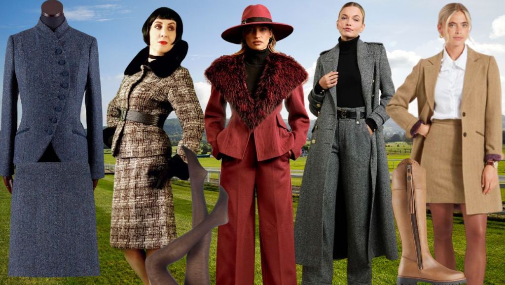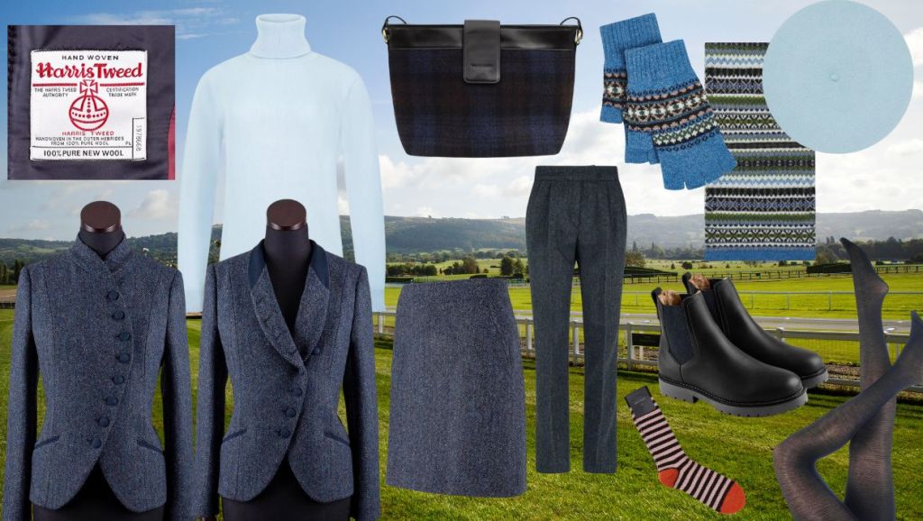 Walker Slater Emma Jacket is made from Harris Tweed and has a fitted, asymmetric cut based on the style of a Victorian riding jacket. The collar can be worn turned and buttoned all the way up, or folded down and half buttoned to create a lapel. The cut of this jacket is particularly flattering on those with curves, but if you don’t have curves it will give the impression you do. The jacket comes in various tweeds, this one is a navy blue herringbone pattern with vibrant cobalt hues and flecks of rust and mauve throughout. £345.00. Team with their tapered Cara Trouser , also in navy herringbone Harris tweed. £165.00 or Willow Skirt in Navy Herringbone Harris Tweed £145.00. Layer with the soft feel of merino wool in their Freya Roll Neck 90% merino wool 10% cashmere. Available in a variety of colours including dove blue. £95.00. Add a touch of je ne sais quoi with Walker Slater Wool Beret . Available in various colours, so you can match with your outfit. The skies may be grey on the day but this beret will keep it sky blue. 100% merino wool. £34.00 Although the beret is now synonymous with France, the Scottish working classes started to wear this style of hat as early as the 16th century. They called it a bonnet or tam o’shanter and it was worn to protect them from the harsh weather. Team with their Renton Scarf in 100% lambswool with a modern interpretation of the traditional Fair isle pattern. Available in shades of blue or pinks. £79.00. Choose fingerless gloves so you don’t have to take them off when handling betting slips etc. Dulnain Wool Gloves in navy features a classic fair isle inspired pattern with plain coloured accents. Made from a soft new wool £28.00 Accessorise with The Tamson Tote bag in Harris Tweed navy tartan. £145.00. Step out in Fairfax & Favor’s Sheepskin Boudica Ankle Boots – An all-terrain boot, in waxed leather with a snug shearling lining. Available in mahogany, oak and black. £265.00. With the short skirt wear Trasparenze Jennifer Merino Wool Tights | SOCKSHOP to keep the legs warm. 60% Merino Wool with stretchy Polyamide and elastine for a great fit. Available in various shades including navy £26.99. For the trousers go for Walker Slater’s Kilrenny Sock | Pink Stripe in a blend of 62% Wool, 38% Polyamide £16.00