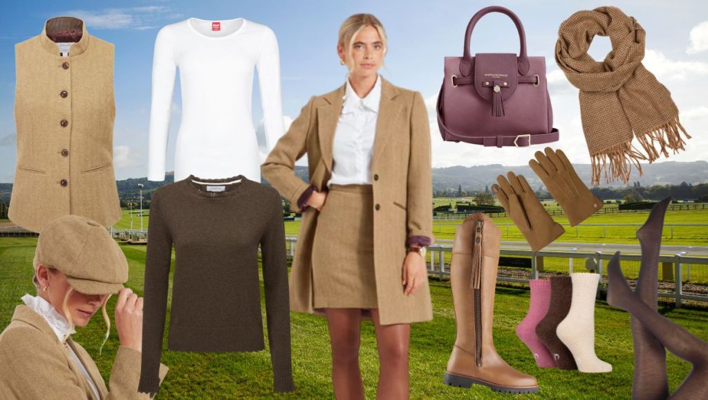 Schöffel Country’s Moray Tweed Jacket is a long line jacket just above the knee and made using British-milled Lovat tweed. Detailing includes branded horn-button closure and two jetted pockets with trim. £450.00. Here paired with their matching above the knee Beauly Tweed Skirt Oak £160.00 and their Somerleyton Shirt in white cotton with a romantic frill collar and cuffs £90.00 For an extra layer of warmth, layer underneath with SOCKSHOP Heat Holders 0.45 TOG Long Sleeve Vest in white. The finely brushed inner provides insulation by the gently fleeced fibres holding warm air within and around them, close to your body. £19.99. Then layer over with Schoffel’s matching Millport Oak Tweed Waistcoat £270.00 or their Leyburn Knit Jumper in chocolate. The jumper’s neckline will perfectly frame the frill collar. £100.00. Finish off with their matching Newsboy Cap in Oak Herringbone Tweed another popular hat style for the winter races especially when worn with a tweed outfit. £75.00. When wearing a short skirt, choose thick tights to keep warm, such as .Trasparenze Jennifer Merino Wool Tights from SOCKSHOP These are made of 60% Merino Wool for warmth with stretchy Polyamide and elastine to prevent wrinkling. Available in various shades including dark brown or winter white £26.99 Two-thirds of the car parks are on grass, so it could be muddy. The best footwear is a pair of boots. Plus you can get away with a lower heel and still look chic such as Fairfax & Favor Explorer Waterproof Boots is an all-weather and all-terrain knee-high boot. In smooth waxed leather with a waterproof Sympatex® lining, that keeps your feet dry and warm. With a heavy duty YKK® zipper and Vibram sole plus a padded memory foam insole for all day comfort. Finished with the intricate scalloped fan and the signature Fairfax & Favor tassel. Available in oak or mahogany leather. £450.00 And if you have room in your boot add a pair of socks such as SOCKSHOP Wool Blend Thermal Socks £8.99 Don’t forget the hands! Keep them warm with Fairfax & Favor’s Berwick Shearling Gloves in tan suede £135.00. Feel cosy in Schoffel’s Edale Scarf in brown houndstooth pattern lambswool made at Lovat Mill in the Scottish Borders. £60.00 Complete the look and add a touch of colour with Fairfax & Favor’s Mini Windsor Handbag in soft heather suede. Also available in other colours. £285.00