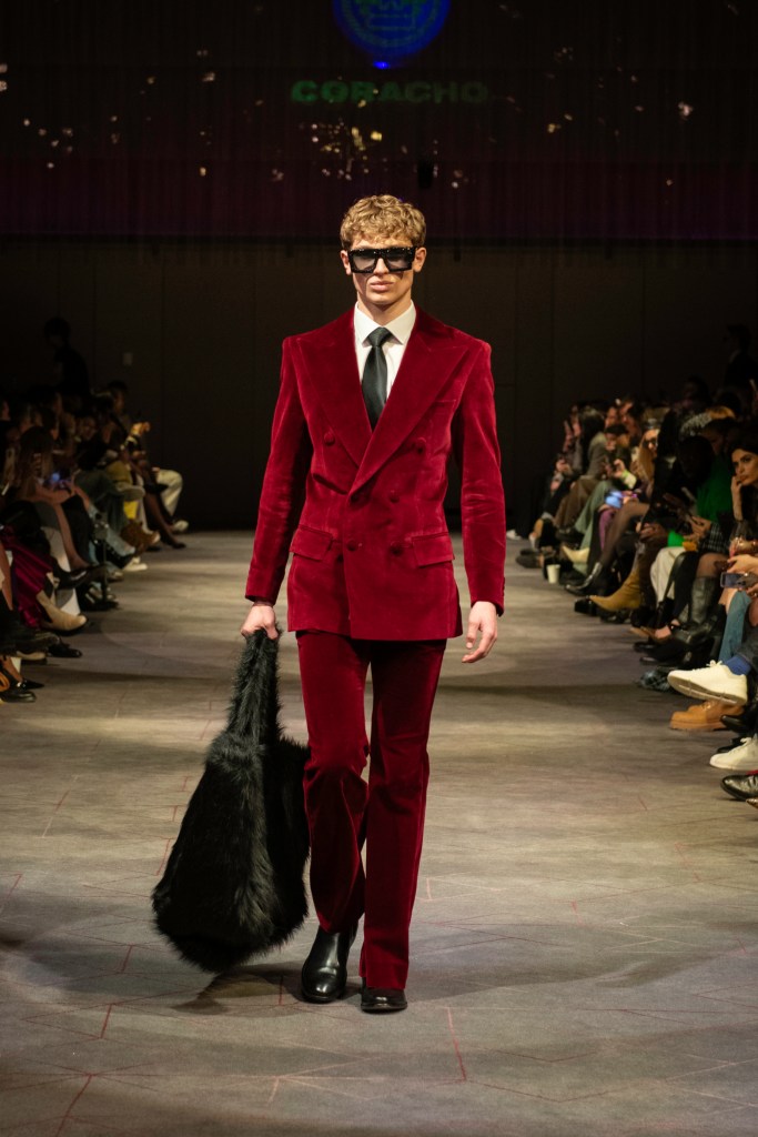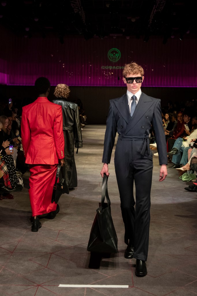 Luxurious British fabrics, such as cashmere, velvet, leather and wool enhance the collection’s richness and have been beautifully rendered into strong tailored silhouettes.