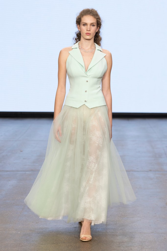 Luxurious eco-conscious materials set the foundation: recycled fabrics, ethically sourced Bursa silk, delicate French lace, and gossamer-light tulle.