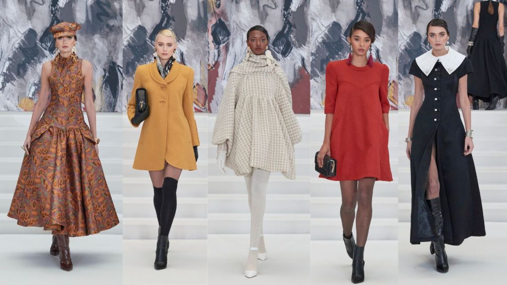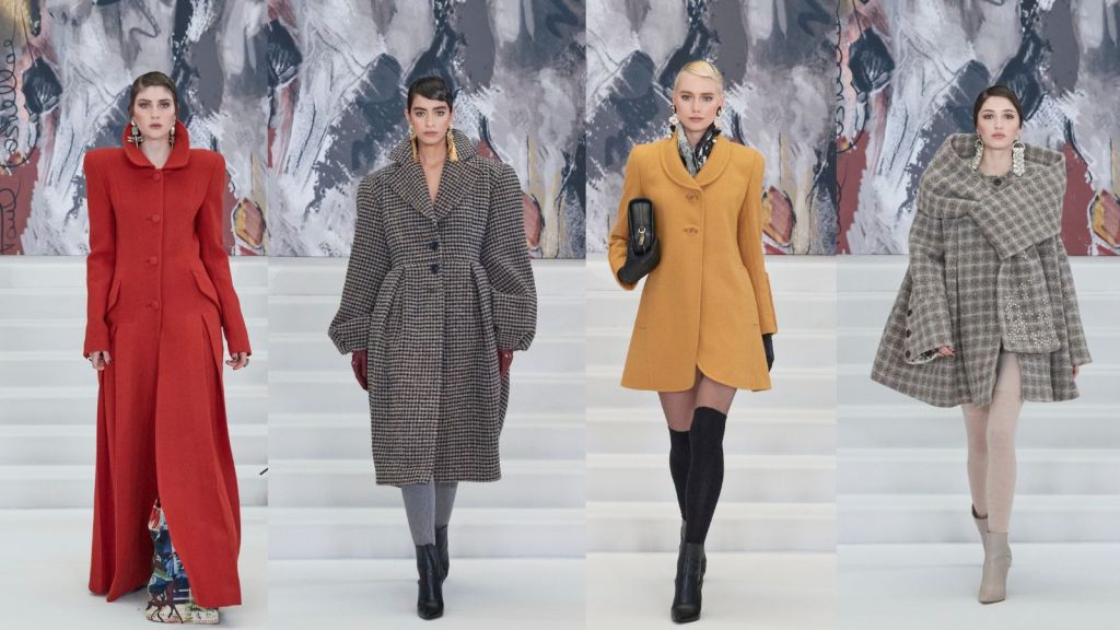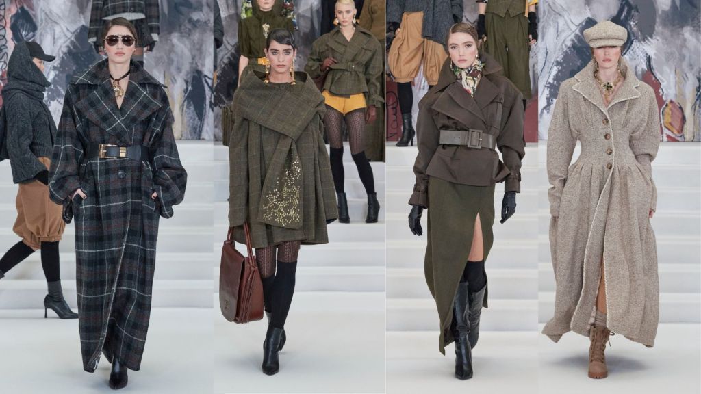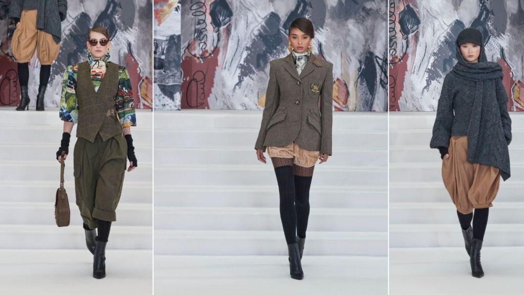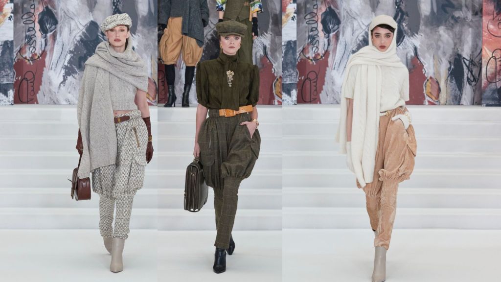 The traditional equestrian jodhpur gracefully canters onto the runway with a modern twist. Snug fitting from below the knee to the ankle but instead of the original flaring at the hips, the look is updated with extra volume sporting large flapped-patch pockets and zipped side pockets. Convenient for racegoers racing items. Seen in tweed, wool and a luxurious cream velvet corduroy. Worn with matching Baker Boy caps.