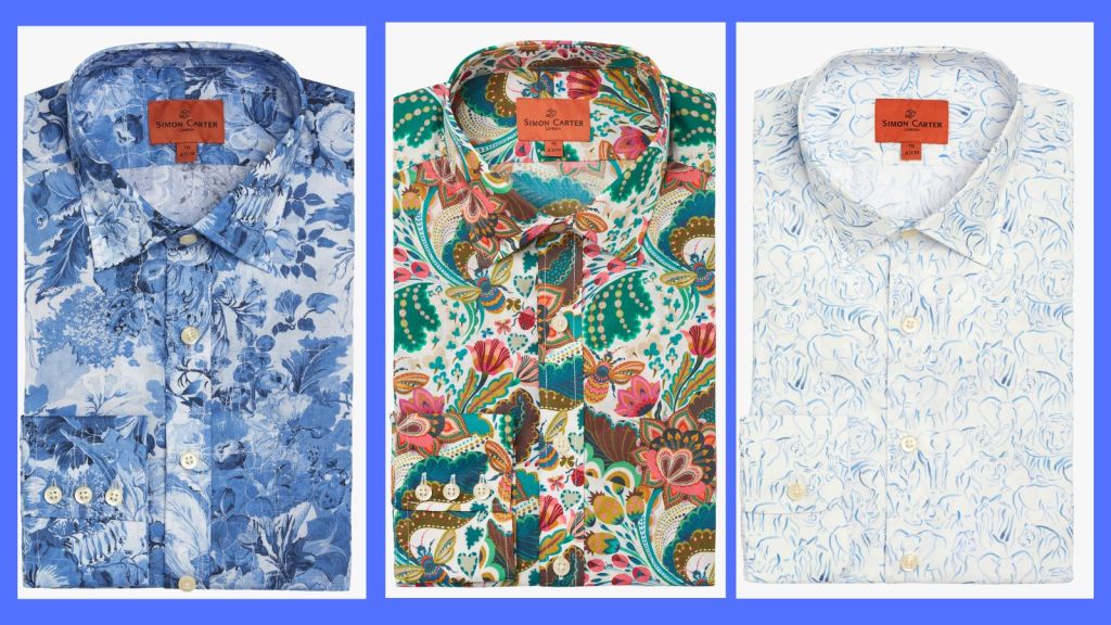 In shades of blue, Simon Carter’s Parchment Petals Shirt (£175.00) is a Liberty of London print of roses, poppies, narcissi and tulips so densely packed that there’s almost an abstract quality. Made with Liberty’s famous 100% cotton Tana Lawn® fabric, renowned for its softness. This will uplift your navy or dark grey suit, whilst giving depth to the lighter greys.