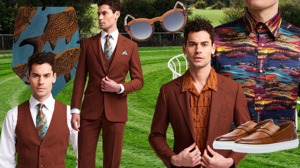 Most gentlemen wear suits at this event. If you don’t want to fade into the background, swap those dull business suit colours for a more vibrant shade or a patterned suit. Hang up your grey/navy work suit for a day of colour. This is definitely a bold move and confidence is one accessory you need to carry around with you. Be the Golden Boy in Gresham Blake’s Burnt Orange Wool Suit £575.00 Dress it up with matching Burnt Orange Waistcoat £165.00 and a crisp white shirt. Add a touch of fun with Light Blue Goldfish Tie in jacquard silk £85.00. Jazz it up with the vibrant Garage at Dusk Silk Shirt £255.00 or go smart casual with short sleeved cotton Graphic GB Red Jacquard Bowling Shirt £175.00 All options will give a sartorial style. Enhance your coolness with a pair of brown GUESS® Round sunglasses Men with gradient blue lenses. £95.00 Whichever style you choose, complete the look with Oliver Amesbury Tan loafer – a contemporary update on the classic penny loafer. £179.00 also available in navy.