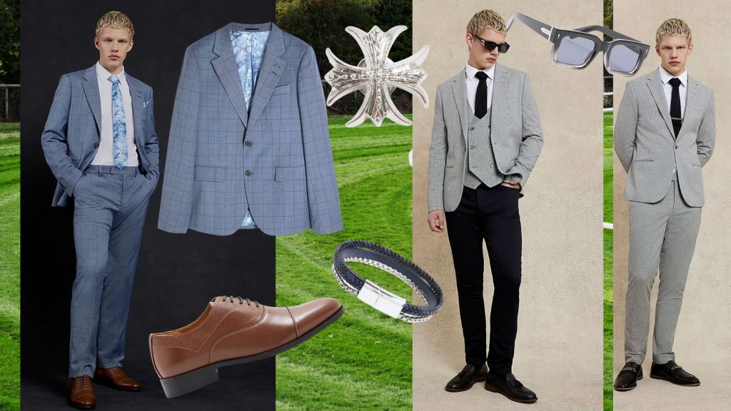 River Island offers affordable suits so you don’t have to break the bank. Their Blue Check Skinny Suit Jacket has 3% Elastane to give some stretch (£85.00). The lining is a blue rose pattern which ups the fun sociable status of the jacket. Here shown with the Blue Check Skinny Suit Trousers £45.00. Brown Textured Lace Up Shoes in faux leather £40.00 and Blue Textured Floral Tie & Handkerchief Set £16.00 which matches the suit’s lining. This also comes in beige colour and as the traditional sartorial rule is not to match a tie and pocket square, mix up the colours.