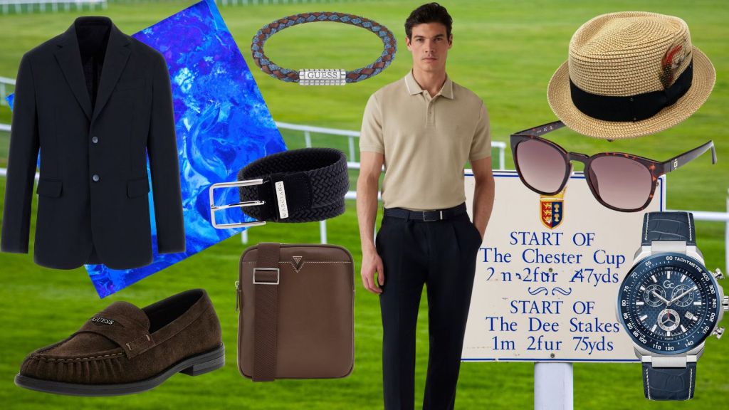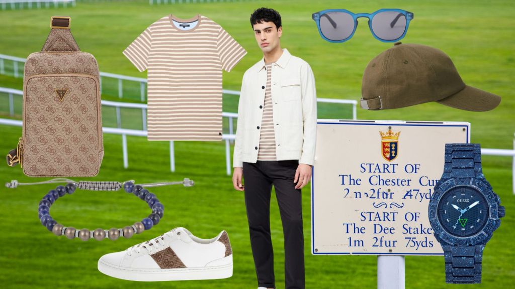 Add some fun and a pop of colour to your outfit with their Faceted Preppy Sunglasses in seamoss £45.00 and GUESS® Recycled plastic analogue watch in speckled blue. £209.00. Keep up the arm candy with Titanium Macrame Bracelet With Sodalite by Tateossian £279.00. Trainers are acceptable in The Roodee, so we’ve chosen GUESS® Todi 4G logo sneakers £85.00.
