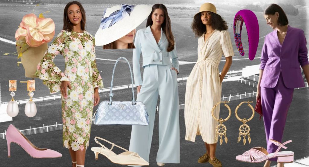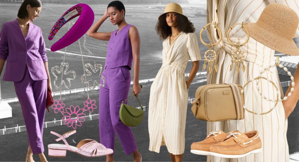For the other enclosures we say dress to feel stylishly comfortable such as the chic but casual Marina Tan/White Linen Blend Knot Front Dress by Joules £99.00 which is also available in a pink/white Toile de Jouy print. Pair with their cloche style Albany Adjustable Straw Hat to shade you from the sun £25.00. Wear a pair of Joules X Chatham Brown Pier Deck Shoes because you will be standing for most of the day, £89.00. Add a touch of shimmer with Joules Trent Gold Cross Body Bag £38.00. Go boho with 18ct gold plated Stacking Pearl Bracelets by ChloBo UK with freshwater pearls £175.00 and their 18ct gold plated Dream Catcher Hoops £88.00. You never know they may make your dreams of picking a winning horse come true!