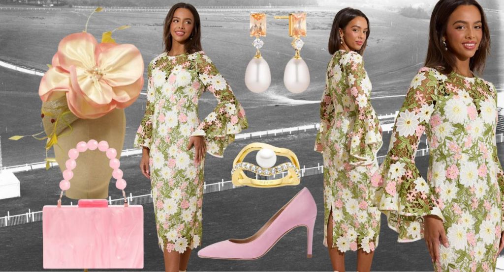 Perfect for Derby Day is Rosaline lace fluted sleeve midi dress by 8thsign An elegant crochet lace dress appliqued with white and pale pink flowers, surrounded by green leaves £180.00 A hat or substantial fascinator is compulsory and most ladies enjoy the opportunity to wear a properly eye-catching creation such as Ophelia floral beret by Bee Smith Millinery £80.00 to hire for 4 days. An ivory satin flower with light pink edges sits on a green sinamay beret base with feathers, curled quills and the occasional ladybird. Most racegoers keep their jewellery subtle or to a minimum in order not to overshadow their hat and dress. A pearl drop earring is chic and the colour is neutral allowing the colours from the hat and outfit to take centre stage. Galatina earrings by Sif Jakobs Jewellery are 8 karat gold plated with champagne emerald cut zirconia and large freshwater pearl. Was £139.00 Now £69.50. Due to the dress’s fluted sleeve, go for a ring rather than a bracelet. Keeping with the pearl theme is Ponza ring by Sif Jakobs Jewellery Was £165.00 Now £82.50. Your hat and dress are the main attraction so choose a small to medium sized handbag in a colour to complement your outfit rather than a statement oversized bag. Compact top handle bags add polish and style such as Maeve Pink Acrylic Resin Box Clutch Bag by L.K.Bennett, London £139.00. A simple court shoe in a summery colour can complete your style, keeping the look fresh and elegant from head to toe such as Classic Floret Pink Suede Pointed Toe Courts by L.K.Bennett, London £149.00