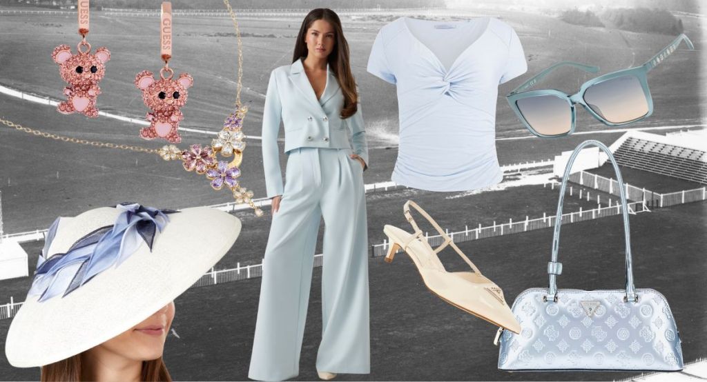 We say: Although there is no dress code, most ladies will be glamorously dressed and wear a headpiece. This light blue trouser suit by Guess would also be acceptable attire in the Queen’s stand on Derby Day Cropped crepon blazer £95.00 with matching Pleated wide-leg crepon pants £85.00 Keep the clean look and wear underneath GUESS® Sweetheart top in light blue £50.00. Headwear is not compulsory but most ladies still like to wear a hat or fascinator to complete their racing style look .Isabella petal brim by Bee Smith Millinery is a white sinamay brimmed hat with hand dyed shades of blue organdie petals. £100.00 to hire for 4 days. Be mysteriously chic and pair your wide brimmed hat with GUESS® Square sunglasses in blue £100.00. Step out in style with GUESS® Jesson patent slingback in cream patent look, £95.00, and swing that shiny blue GUESS® Arnela 4G Peony Logo Shoulder Bag with confidence. £125.00 Have fun wearing GUESS® Vintage guess earrings with its pink teddy bear charms £120.00 and GUESS® Lily necklace £70.00