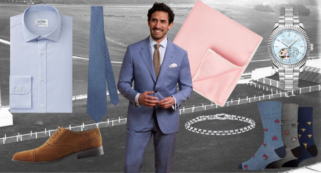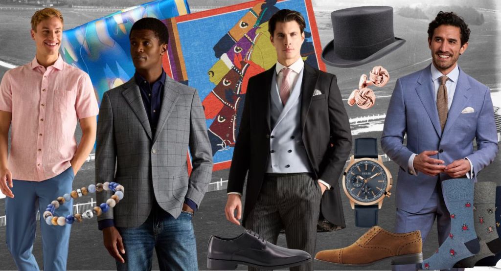 For the Grandstand: Grey Slim Fit Check Blazer by Joules is a sartorial alternative to the suit . In 50% cotton 50% polyester £179.00. Increase your dapperness with a colourful silk pocket square such as THE PAINTED DESERT pocket square by Geoff Stocker £45.00 and Fern Leaf Lapel Pin In Palladium Plated by Tateossian £120.00.