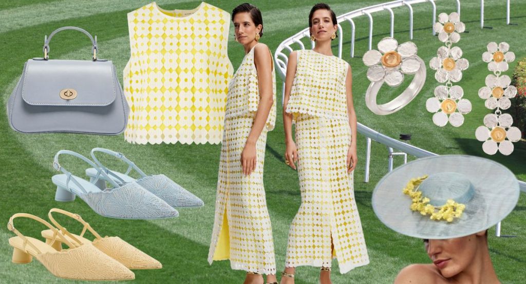 Complete the look with Katherine Elizabeth Millinery’s Eliza baby blue boater with yellow silk flowers and handmade from sinamay straw. £665.00 and Tusting Mini Holly Top Handle Handbag in ice blue leather. £395.00