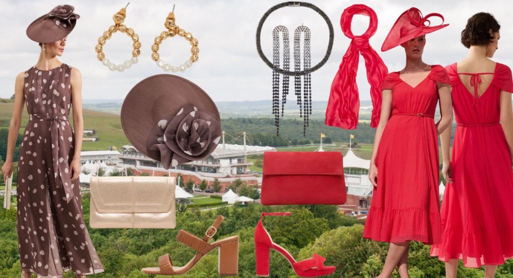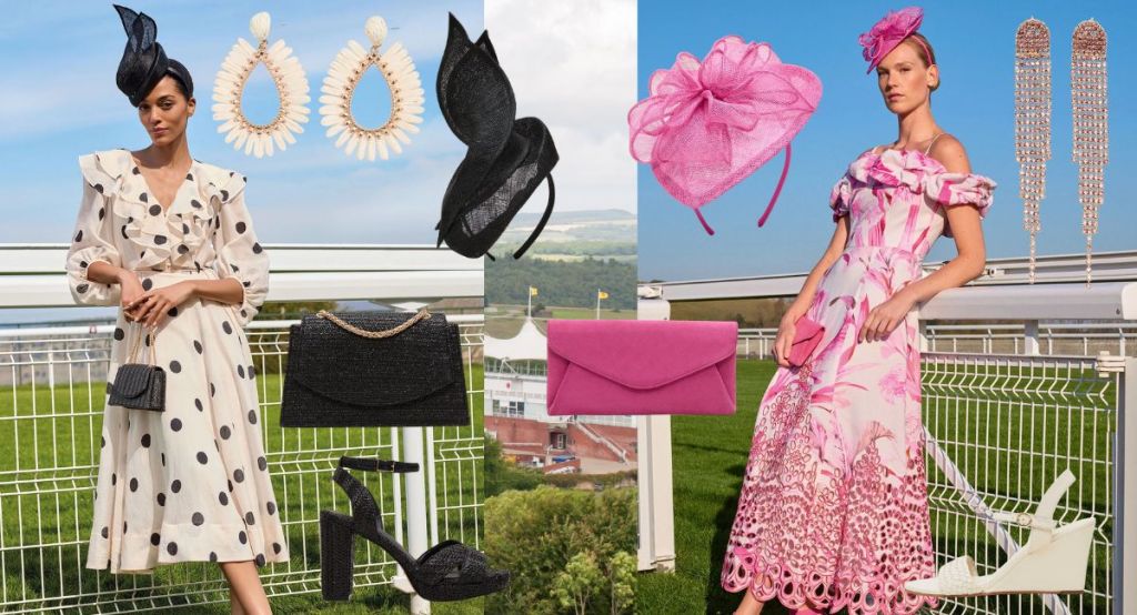 The polka dot dress is always a winner at the races. Jaqlyn Spot Dress in cream with large black dots. £169.00. The flowing midi dress has ruffle detailing and blouson sleeves adding volume to the silhouette Pair with black accessories: Twist Fascinator in a pillbox style finished with a twisted applique giving contemporary flair and height. £59.00 Raffia Clutch Bag in black £79.00 and matching Raffia Platform Sandal £119.00 The high block heel is a great alternative to the stiletto on uneven ground. Break up the black with Raffia Earrings in ivory, although they are available in black too £19.00