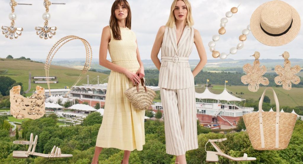 Look chic and cool in Tabitha Waistcoat £129.00 In ivory and a gold thread to add a touch of glamour . With matching cropped culotte style Tabitha Suit Trouser £119.00 Pair with Patent Block Sandal in ivory £99.00 The low block heel is perfect for all day at the races. Go for a larger bag to help carry your picnic essentials such as Straw Shoulder Bag £55.00 . A hat/fascinator is not essential and most don’t wear one in this enclosure but Casual Straw Boater will complete the outfit and offer shade from the sun. £35.00. Accessorise with Beaded And Pearl Necklace to complement both the ivory and gold thread of the outfit. Was £25.00 now £17.00 And Raffia Oversized Flower Earrings in natural, Was £25.00 now £18.00