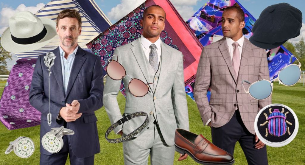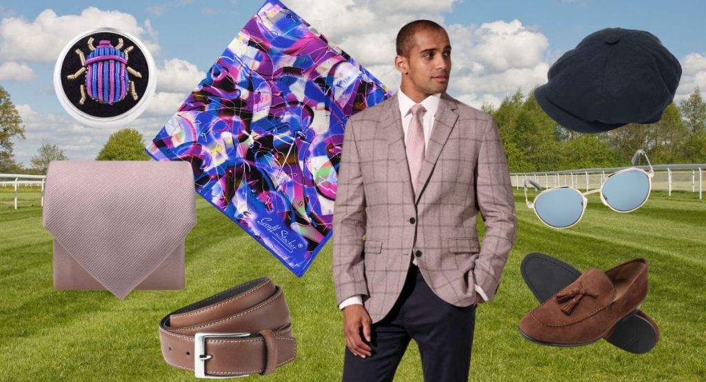 If you prefer not to wear a suit, then opt for a stand out summer jacket such as Brook Taverner’s Neeson Rose Windowpane Check jacket in a blend of 39% linen 31% polyester, 30% Wool. Was £149.00 now £134.10. Pair with their Caine Navy Linen Cotton Trousers in 52% linen, 48% cotton. Were £69.00 now £62.10 These trousers require a smart leather Brown Belt Was £49.95 now £44.96 The jacket is the star of this outfit so style with a crisp white shirt such as Single Cuff White Poplin Cotton Shirt Was £49.95 now £44.96 and a plain Pink Twill Silk Tie Was £19.95 now £17.96 Step out in a pair of their Brown Suede Tassel Loafer Were £99.00 now £89.10. To have a chance of the most stylish, don’t forget those little touches such as 8-piece Linen Gatsby Bakerboy Newsboy Cap by Cotswold Country Hats. £24.99 In 100% linen, fully lined and also available in stone; SIDEWINDER silk pocket square by Geoff Stocker for a pop of bright colour £45.00, and GUESS® Round sunglasses in shiny pale gold with blue lenses. £110.00. Show your love of nature with Deakin & Francis Sterling Silver Embroidered Light And Dark Purple Bug Lapel Pin This intricate ladybug design have been hand-stitched for them by London’s premier embroidery house and is one beautiful bug you won’t mind staying on your jacket! £150.00