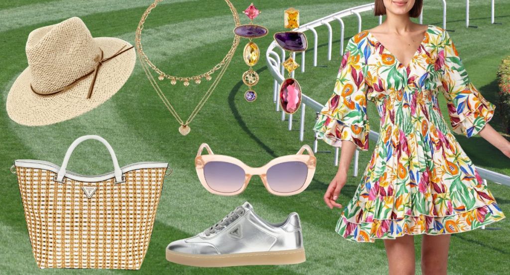 Keep hold of the last days of summer in Goddiva’s Mini Dress In Tropical Papaya Print with ruffled sleeve cuffs. £42.00 If you are not in the Premier Enclosure then wear comfy statement sneakers so you can join in the fun. GUESS® Jazlie laminated leather-blend sneaker in shiny silver. Were £97.00 now £47.50 Carry a medium or large handbag for all your family funday essentials GUESS® Atalia raffia handbag Was £150.00 now £75.00 Go for a more casual style hat such as Barts Arday Straw Festival Fedora Hat in cream in cream Available by Cotswold Country Hats £12.99 Accessorise with GUESS® Square sunglasses in sunny orange £85.00; GUESS® Crazy in love necklace – a double layered necklace consisting of wide and narrow links, with heart shaped charms of pave embellishment and crystal appliqué. £85.00 and the colourful GUESS® Petra earrings made of crystal and cubic zirconia appliqué. £100.00