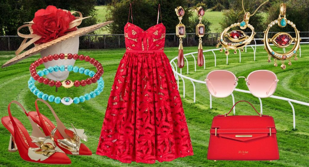 Stay cool but look red hot in Self Portrait’s Red Bow Embroidered Midi Dress with its large bow shape embroidered on the bodice and a slim bow motif belt. Cotton embroidery with linen/cotton trim and a full polyester lining. £350.00 The low sweetheart neckline and thin spaghetti straps present a blank canvas for a statement necklace such as Thomas Sabo’s Elyndra Eye Pendant An amulet pendant made from recycled 925 silver with 18k gold plating. In the centre shines an eye-shaped garnet-red zirconia framed by sparkling white zirconia and protective turquoise-colored stones. £360.00 Pair with their Elyndra Earrings Garnet-red zirconia & teardrop red agate which is a symbol of strength and vital radiance. £270.00 Add arm candy in the form of Red Bead Bracelet with round red-agate beads and a gold-plated eye bead with garnet zirconia £125.00 And maybe cool the temperature and stack with Elyndra Turquoise Bead Bracelet in polished imitation turquoise with a central silver eye motif set with a turquoise stone £110.00 It’s time to raise the heat again and take a sizzling step forward in Kat Maconie’s Tamannaah Pumps £440.00 They’ve transformed the classic slingback into a standout piece with its oversized gold flower embellishment and gold heels. Top it up with Mi Bolsa London’s Top handle “Mi” handbag in Ruby Red £243.00. Don’t forget your rose coloured sunglasses to keep an optimistic view when placing a bet. Thomas Sabo’s Square Mia in pink | Were £170.00 now £85.00. Heads Up – Increase your chances of winning the Best Dressed and wear a hat. Carmen Hire – Jess Collett Milliner This wicker finish straw boater with pinopok swirl and red silk flowers will be perfect for the red dress. Retail price of £950, this boater can be hired for 3 days at a price of £120.00 plus postal charges and a refundable £150.00 security bond.