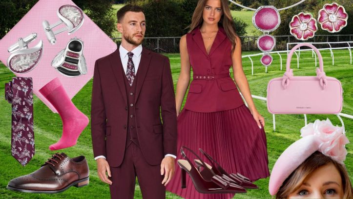 Team with Slater Menswear – the official menswear sponsor of Ayr Gold Cup. The gentleman wears their Burgundy Textured Three Piece Suit offering a stand out colour to the normal greys and dark blues. Was £199.00 now £125.00 from their exclusive OneSix5ive range. Styled here with a burgundy & pink Floral Tie £8.00. Wear with a double cuff white shirt such as White Bluff Collar Double Cuff Long Sleeve Shirt £20.00 to show off Sheila Fleet’s Paisley Leaf Enamel Cufflinks in sterling silver. A contemporary take on the paisley design in polished silver relief. Hand-enamelled in their Orkney workshop in Champagne enamel. £194.00 . Add their Bumblebee Small Lapel Pin on to your lapel. Not your ordinary bumble bee colours as this one is in vivid Hot Pink enamel and framed by polished silver wings £85.00 Finish the dapper touches with Slaters light pink Oxford Pocket Square £4.00. Stand tall in Cheadle Lace Up Derby Brogues in dark burgundy leather £89.00 and add a flash of pink with a pair of Plain Cotton Rich Socks £3.00