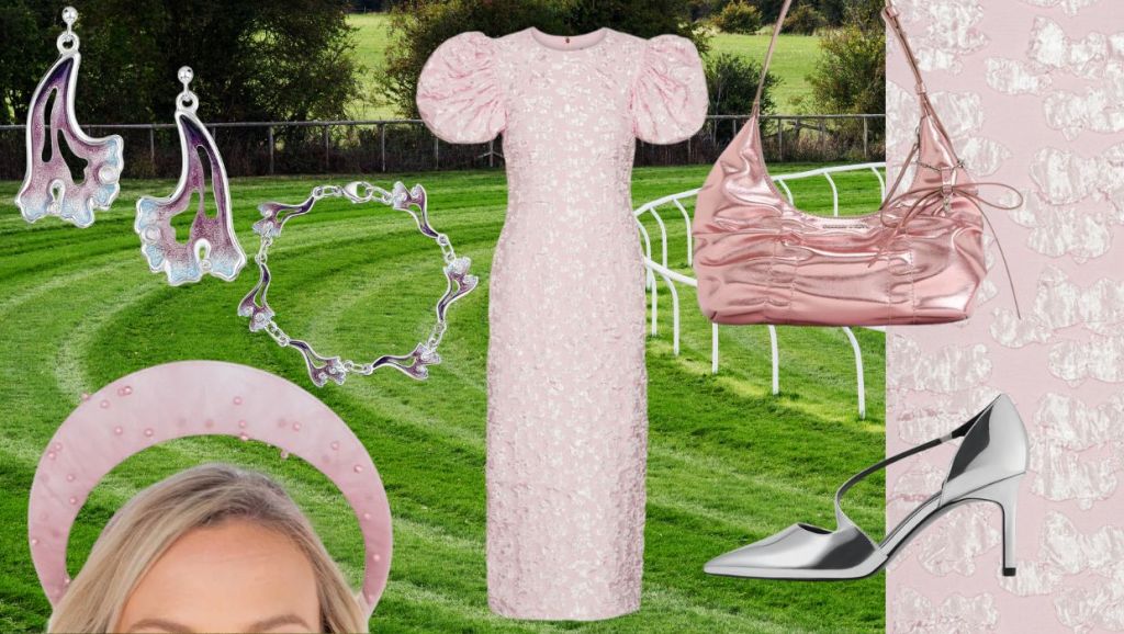 Go pretty in pink with Jacquard Midi Puffy Dress by ROTATE Birger Christensen in light pink. 350 Euros. Also available in burgundy and in white, The dress features a fitted midi-length silhouette with voluminous puff sleeves. It has a high round neckline and a structured shape with textured jacquard fabric. The dress fastens at the back with a concealed zipper and has a slit at the back for ease of movement. Although a hat is not compulsory, you really need a show-stealing one in order to catch the crowd’s eye and become a finalist in the Best Dressed Ladies Competition. Stephanie Gallen Millinery’s Crescent Pink is a modern halo style, wrapped in dusky pink netting adorned with pearls and secured on a metal hairband. £40.00 to hire for 4 days, plus postage. Shine with Charles & Keith UK’s Asymmetric-Strap D’Orsay Stiletto Pumps in silver metallic £59.00 and their Kadee Ruched Bow-Charm Hobo Bag in metallic pink £79.00 Accessorise with Sea Moss Moonstone & CZ Dress Drop Earrings by Sheila Fleet Jewellery £262.00 and matching Sea Moss 6-link Cubic Zirconia Bracelet £397.00 Inspired by the heart-shaped tips on some of the sea moss forms, Sheila worked with her in-house designer, Olivia Yorston, developed a beautifully organic collection. Each earring is enhanced with a moonstone and cubic zirconia, whilst each bracelet link has two cubic zirconias. Both hand-enamelled in Sea Pink enamel in their Orkney workshop.
