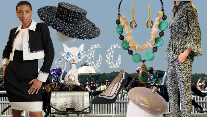 Hats are not compulsory for British Champions Day with many ladies choosing not to wear one; however it is still a major racing event and will complete your fabulous outfit. Don’t go too ostentatious; aim for a subtle style such as Camilla hat by Elena Shvab Millinery Was £395.00 now £158.00 as it is a sample hat which was previously on display in the studio and has slight signs of handling. A classic style black and white boater hat with wide brim and trimmed edges. Made of stylish boucle tweed fabric which means it will also not look out of place for the jump season race days. Complete the look with Eva Pumps by Polina Magiy Shoes in black suede and with a faux snake skin trim. Were £320.00 now £190.00 and a silver Evening clutch by Malusha Shop with black trim £280.00 Malusha handbags can also be seen at Room 18 boutique.