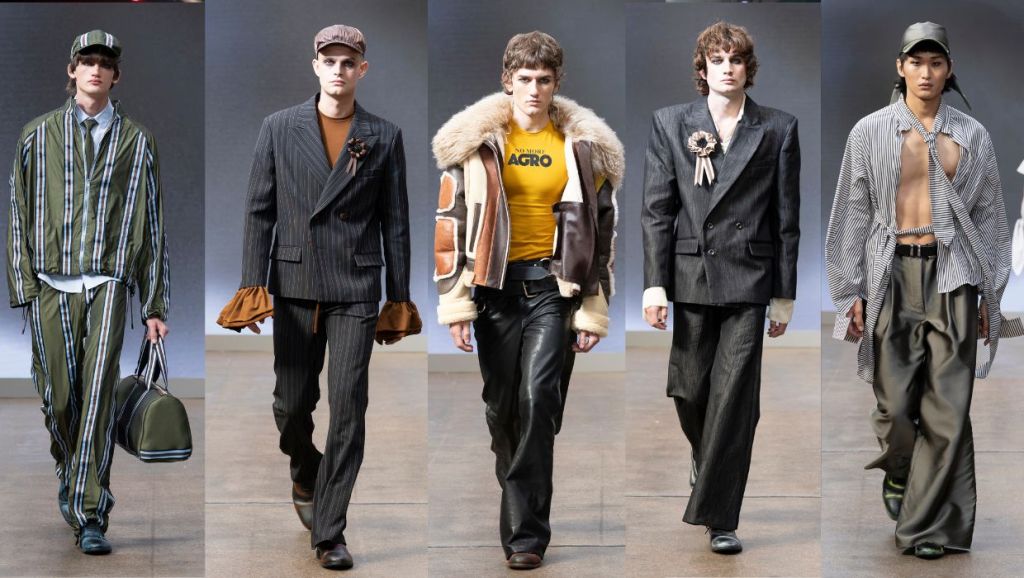 The SS26 collection is titled Prophet. Referencing tarot, the jester, and the contradictions of the modern age, the collection pulls at the tension between certainty and confusion. Couture ball gowns are paired with British school shirting, leather with tulle, shearling with technical fabrics. The result is harmonious chaos, an aesthetic that has become the AGRO signature.