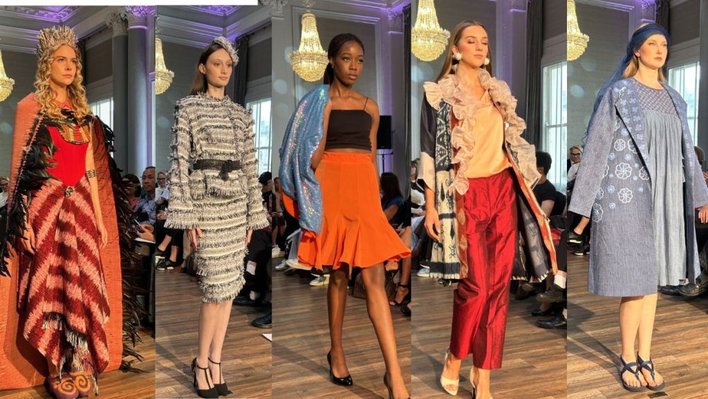 Fabrics used: Handwoven ikat textiles and woven leather of Narda’s of the Cardilleras in Baguio, Philippines and the Nuno felts of Kazakhstan artists. Ong’s hand painted silks and cottons using his own discovered wild figs fermentation natural dyes.