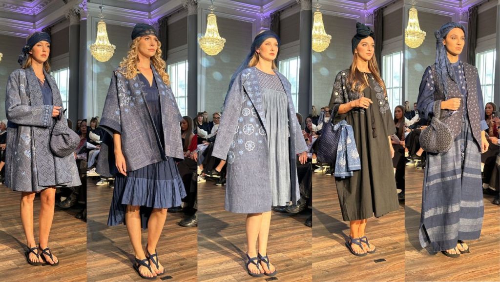 Titled Les Beaux Papillons, the colour palette is shades of indigo and black. Styles are easy for resort and warm weather destinations. All the pieces are handmade and handwoven. Designs amplify a connection to nature and cultural heritage with butterflies, bees and floral motifs.