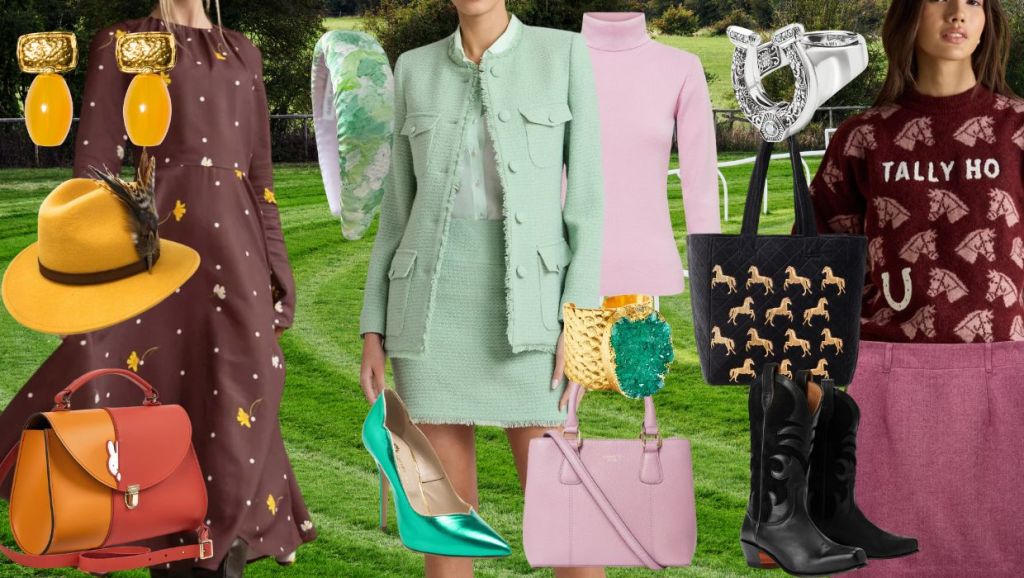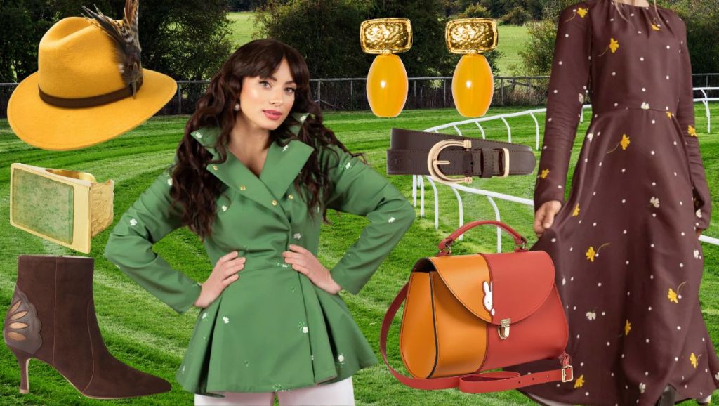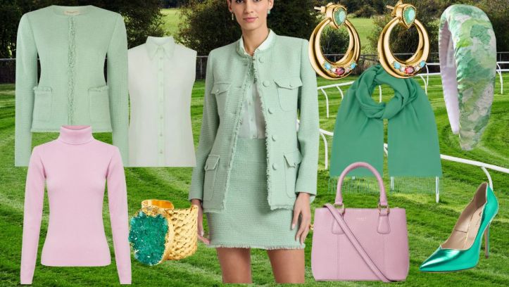 Add another layer with The Rainbow Wrap by Osprey London in jade green. Was £65.00 now £45.00 Depending on the weather, a suit looks stylish with most types of footwear – sandals, flats, stilettos or boots. A full shoe is versatile for warm weather and cooler weather when worn with tights. Eva pump by Polina Magiy Shoes in metallic green leather and gold piping brings a shiny touch of glamour. £590.00 Hats are optional and most racegoers tend not to wear one. If you do decide to – aim for something neat such as a pill box, beret or a headband. Isabel Manns Meadow Whispers Silk Satin Padded Headband merges swirling, luminous greens with Van Gogh’s expressive brushstrokes, echoing the depth and dynamism of his iconic skies and landscapes. £45.00 Rather than choosing a small clutch bag, take a reasonably sized handbag to carry all your racing essentials such as scarf, gloves, umbrella and sunglasses. But choose a summery shade. The Mini Adaline Leather Grab by Osprey London is still compact enough as to not overshadow your outfit but large enough to fit some essentials. Plus it is available in summery heather to contrast with the green. Was £245.00 now £145.00 Wear statement earrings like Thomas Sabo’s Half-Hoop Earrings in 18k-gold-plated recycled 925 silver with faceted green aventurine stud & vibrant turquoise, garnet & white zirconia detailing £325.00. And a statement ring Yaa Yaa London’s Green ‘Crystal Crush’ Gold Statement Ring is of semi-precious handmade crystal agate gemstone in verdant green shades set in a textured gold-plated thick band. £45.00.