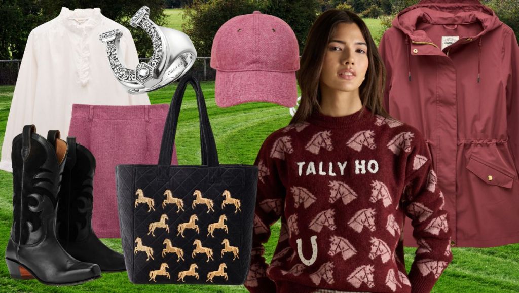 Embrace the equestrian theme with Joule’s Intarsia Knitted Tally Ho Relaxed Fit Jumper £59.00 Wear their Melanie White Cotton Ruffle Blouse underneath £49.00 and pair with their Bramble Pink Herringbone Tweed Skirt £65.00. Be prepared for the rain or the cooler weather with their Portwell Port Waterproof Raincoat With Hood and Adjustable Waist £89.00 Sport their Tweed Baseball Cap in plum purple tweed £24.00 and accessorise with Thomas Sabo’s Elyndra Blackened Silver Horseshoe Ring with floral symbolism, fine engravings and zirconia stones to create an expressive sign of good luck. £135.00. Keep up the equestrian theme but go West in Victoria boot by R.M.Williams® A rodeo square toed boot with heritage stitching. Handcrafted in Australia from smooth semi-analine leather and suede with a 5cm Cuban heel, it features brass-screwed soles and branded debossed tabs. £750.00 These will look good with either thick tights or bare legs depending on the weather. As the weather is unpredictable in October, carry Elizabeth Scarlett’s Wild Horses Velvet Tote for all those racing day items such as a brolly, gloves, scarf and even sunglasses. £65.00