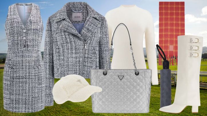 Tweed suits don’t have to be frumpy, they can be modern and contemporary such as Guess’ Tweed biker jacket Was £140.00 now £91.00, and their matching Bodycon tweed mini dress Was £120.00 now £60.00. Team with a pair of thick warm tights and boots: GUESS® Garica Side-Buckle Boot in cream £185.00. Remember Layering is key and your secret style tip when considering what to wear to Cheltenham Racecourse, as well as other courses! So don’t forget to wear a blouse or jumper under that dress. GUESS® Cashmere-blend sweater in white £70.00. Cardigans are another layering option. Pop one under your coat/jacket or go for a chunky cardigan instead and wear as outerwear. The hat … Although hats are not required, many women prefer to wear one to complete their racing day outfit (and to help keep warm!). Don’t bring out your summer hats though, stick to fabrics such as wool felt or (faux) fur to look stylish and keep warm. Add a youthful touch with Guess’ baseball cap style Faux fur hat in cream. £50.00 The Scarf is where you could splash out on colour but choose wisely. When planning what to wear to Cheltenham Racecourse, it’s wise to remember that the right colour will lift your complexion giving a more youthful glow whilst the wrong colour can drain and age you. Luckily scarves come in an array of hues so it should be easy to find a shade to suit your colouring. The Handbag, We Say…Take a medium to large bag so you have room to carry essentials for all types of weather :gloves, scarves, cardigan when chilly, an umbrella if it rains and even sunglasses if the sun does decide to shine. GUESS® Giully Quilted Shoulder Bag £140.00. Don’t let your umbrella let you down in the fashion stakes, if it’s raining this will be on view for all to see. It doesn’t have to be expensive, just in good condition and complement your outfit with its colour or print. A compact umbrella is a good choice so you can keep it in your bag when the sun shines such as GUESS® 4G logo umbrella in grey, beige or brown. £40.00
