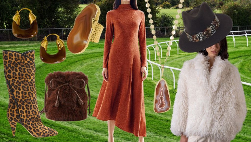 Sparkle in Vivere London’s Lisa Long Sleeve Midi Dress Was £195.00 now £117.00 In golden rust with asymmetrical panels and hemline adding interest. (new stock arriving soon) Look cosy and glamorous in their Cream Shaggy Faux Fur Jacket £225.00. (coming soon) Something to cuddle when the races become tense whilst being practical is their Brown Faux Fur Handbag £75.00. (coming soon) For you shoe addicts Venus High Boot by Casadei® are a must. In a stunning leopard print and brown leather trim creating an asymmetric line which complements the dress. £1080.00 Complete the look with Vivere London’s Sierra Marbled Resin Hoops in18k gold plating £69.00 and Yaa Yaa London’s Ultra Mega Caramel Apricot Adjustable Gemstone Ring in brass plated with 18k gold £67.00, and their longline ‘ULTRA’ Caramel Agate Pendant Necklace with a 42-inch beaded gold-plated chain. Go boho and wear this necklace at full length, or for a shorter style by simply doubling over the necklace to create a two-layered stylish piece. £89.00. Top it all with The Chadlington Wool Fedora Hat with Country Feather Wrap Trim in brown. Available from Cotswold Country Hats. £73.95