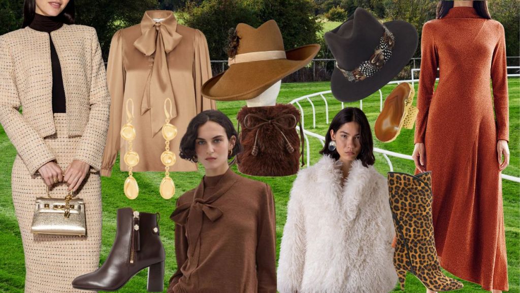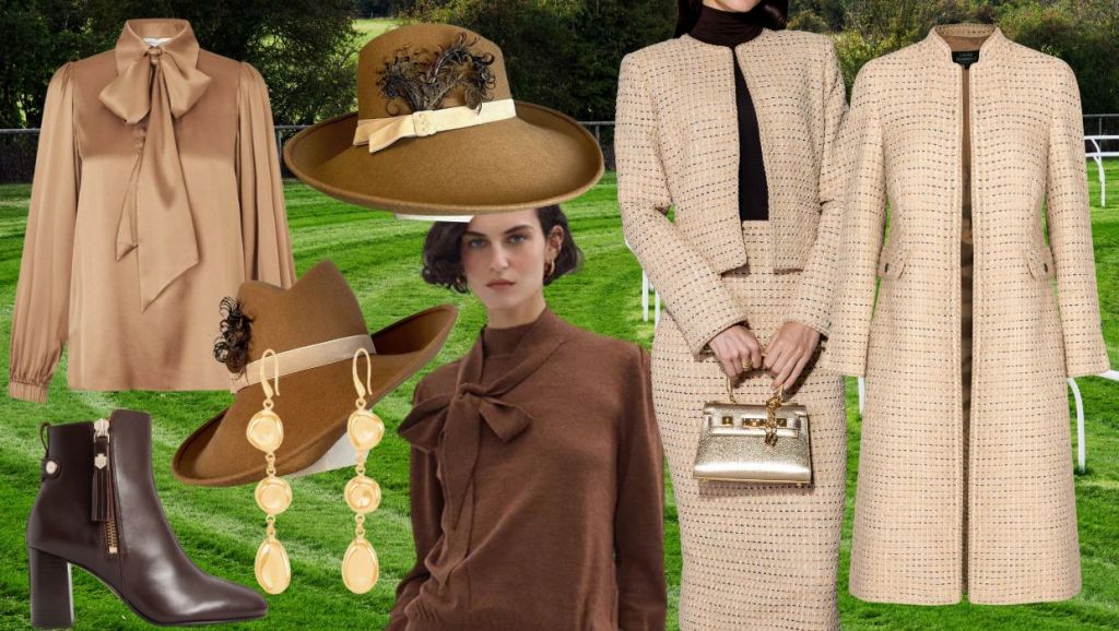 Lalage Beaumont’s Gina Jacket £1250.00 or Claire Coat , £1599.00 both in camel tweed, can be paired with the matching Penelope Skirt £529.00. Depending on the weather wear with Iris and Wool’s Jacqueline Bow Sweater in 100% merino wool £173.73 or Dea Kudibal’s KikkiDEA Russet Blouse in stretch silk twill (90% Silk, 10% Elastane) with a detachable pussy bow. £259.00. Both sweater and blouse have high necks and long sleeves which will allow for a thermal vest to be worn underneath if the weather is chilly. Embrace the Gold Cup and add a touch of gold with Lalage Beaumont’s Gold Sparkle Maya Midi Caribou handbag in soft grainy print Italian calf leather £875.00 and Dower & Hall’s Long Triple Pebble Drop Earrings £360.00. Handcrafted from sterling silver with yellow gold vermeil finish and features a trio of organically-shaped pebbles. Ankle boots are a great style for transitioning from summer to autumn. Fairfax & Favor’s Oakham Ankle Boots in Mahogany Leather has a high block heel and a miniature version of their signature boot tassels. £285.00 Hats are not obligatory but will add to your look and keep your head warm. Fedoras are the stylish go too for autumn/winter races. Make a statement with Elena Shvab’s Beverly, Wide Brim Fedora Hat with Feathers a wide-brim fedora crafted from brown wool felt, finished with a dark cream velvet ribbon, a few pearls on one side on the ribbon and adorned with hand-shaped pheasant feathers, £365.00