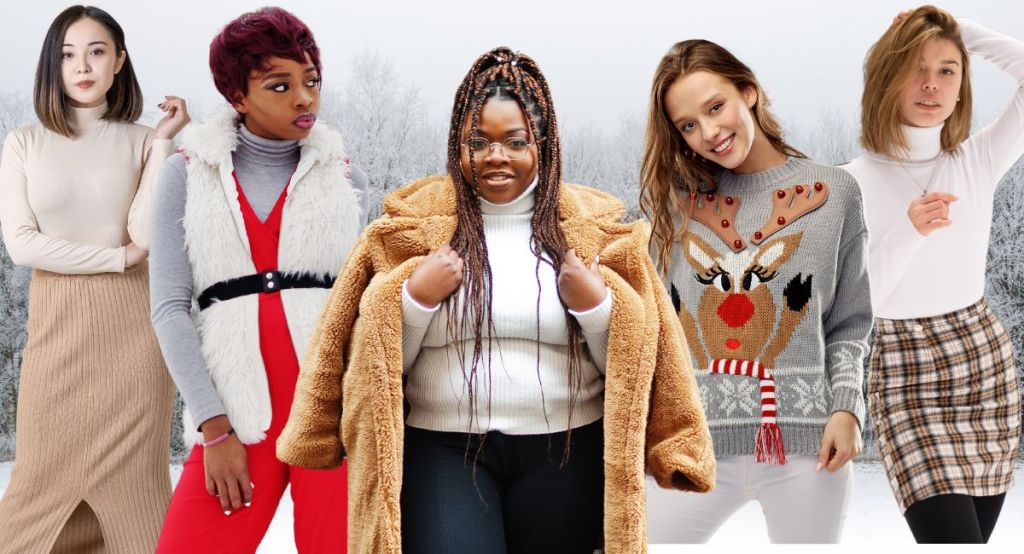Standing outside will be cold, so layering is key with a jumper or cardigan. Go festive with a Christmas jumper. Team with warm trousers, midi skirt or mini with thick tights.