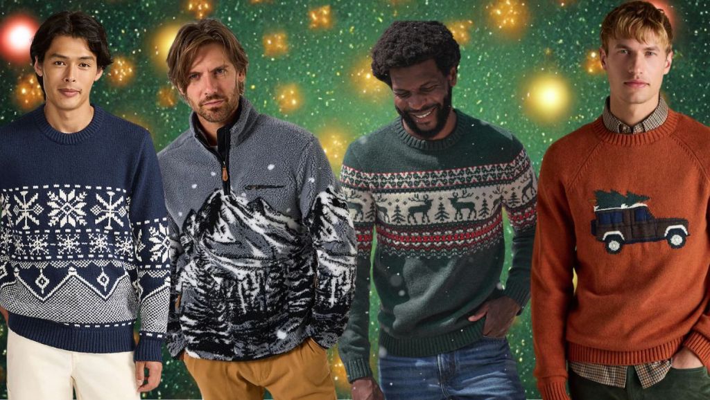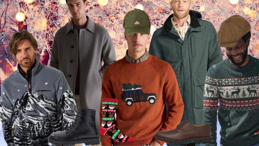 Don’t let the ladies have all the fun in styling, jump into the festivities with a Christmas sweater. After all, you only get a chance to wear it a few times a year. Wear a t-shirt or thermals underneath to keep cosy and warm. In country classic orange, Joules’ Offroad Christmas Jumper displays an embroidered scene on the front of a 4×4 with a Christmas tree on its roof. Price £55.00 Fabric is 60% Cotton, 30% Nylon, 10% Wool, has a ribbed crew neck and is finished with a ribbed hem and cuffs. Featuring reindeer silhouettes and snowflake motifs, Fatface’s Reindeer Fairisle Knitted Crew Jumper adds a touch of festive charm. In dark green, £55.00. Fabric is 60% Cotton, 30% Recycled polyester, 10% Wool. With larger snowflakes in a jacquard print is Lands’ End Festive Snowflake Crew Neck Jumper In navy £90.00. Fabric is 55% cotton, 25% nylon,17% acrylic, 3% wool For a more casual cosy look is Joe Browns’ Climbing High Borg Fleece Funnel with a snowy mountain scene continuing from the front, sleeves and back. £59.00