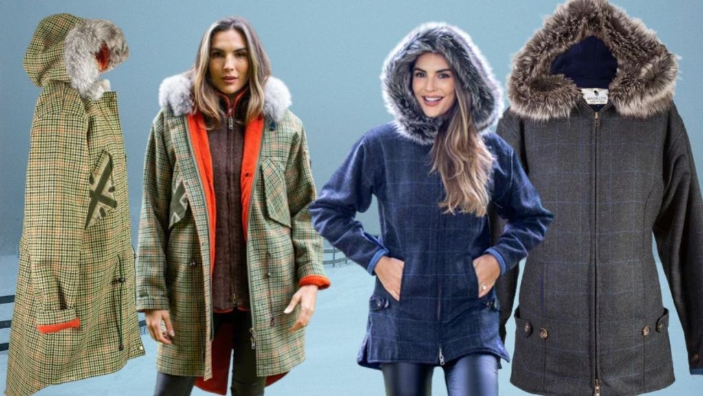Lighten up those grey days with a subtle blue overlay check and blue fleece lining in Maude & Fox grey Fur Fly jacket with hood. Price £365.00 The jacket details are: semi fitted, long zips, faux fur around the hood, hand warmer slit pockets, warm fleece lining, hip length and has tabs at the side allowing it to be pulled in at the hips if required. Also available in Henley tweed with red lining. Fur Fly – Grey