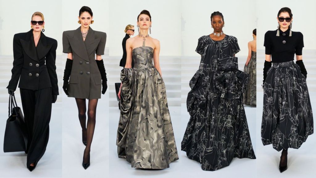 Structured coats and corsetry are softened with tonal silk and organza blouses and wide pleated trousers introduce movement and graceful ease.