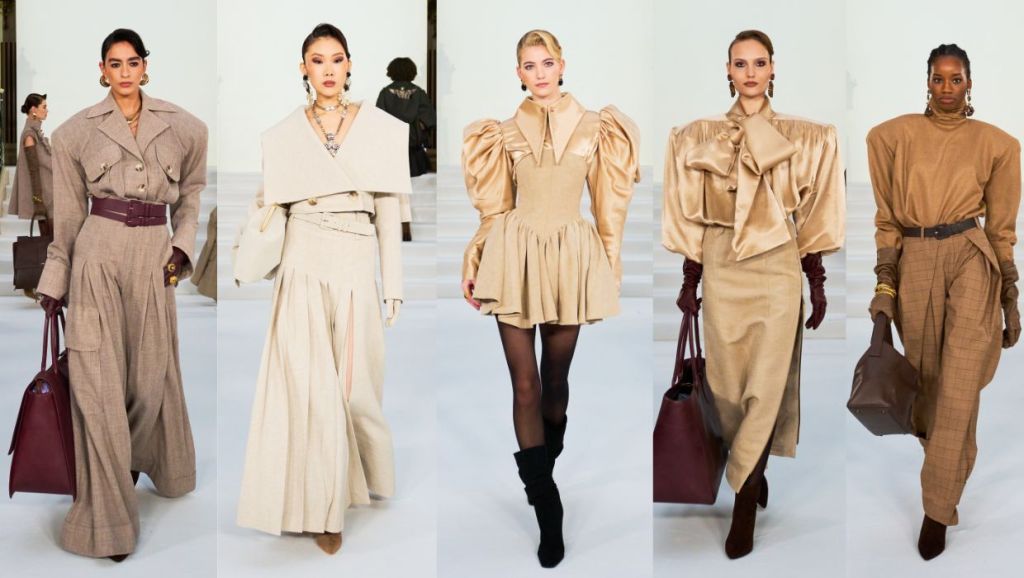 The colour palette starts with soft muted autumnal hues of earth toned tweeds, creams, chocolate and tan browns then changes to the bolder and sharper wintry black and charcoal. The closing look introduced a new dimension of the brand with subtle sequined suits and tuxedos featuring diamante button details, alongside fluid black and silver jacquard dresses.