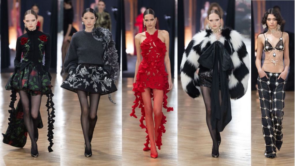 Darkly romantic rose petals appear as garlands and ruffles. Sculpted black and red knitted cardigans are festooned with three-dimensional knitted strands of rose petals, which echo in a red crochet over-embroidered mini dress with rose cut-outs and rose appliqué.