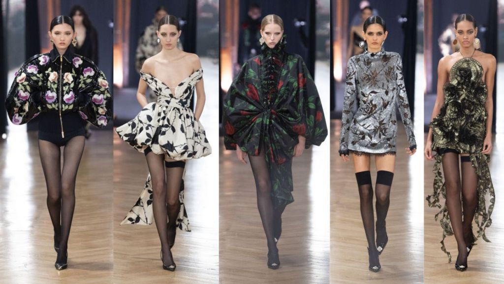 A diva-ish wardrobe takes shape in operatic garments cut with both drama and ease. Blumarine’s emblematic rose takes centre stage. It appears in a red and black print and as a black and white motif emblazoned on taffeta beetle-back capes and balloon-skirt mini dresses. A textural, colourful rose embroidery wraps around a sculpted black vinyl bomber jacket.