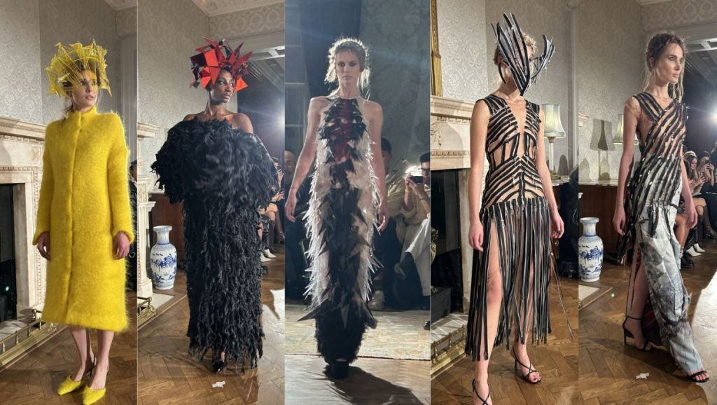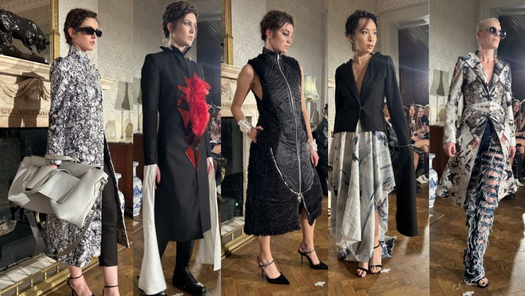 Exaggerated tailoring introduces architectural silhouettes, while deconstructed garments are reassembled with intention and technical precision. Sleeves extend dramatically, proportions elongate, and jackets reveal bursts of fabric that emerge like wounds making it emotional and structural at once. Colour palette of blacks, slate greys, luminous silvers, and sharp accents of red that cut through the darkness like flashes of exposed emotion. Materials of printed silks, mohair and denim are combined with innovative textiles developed in collaboration with forward-thinking biomaterial partners including Ponda – Reclaimed ocean sourced nylon; Savian by BioFluff – plant based bio fur and Banofi – plant based leather altenative.