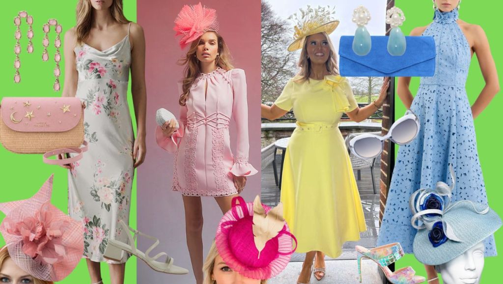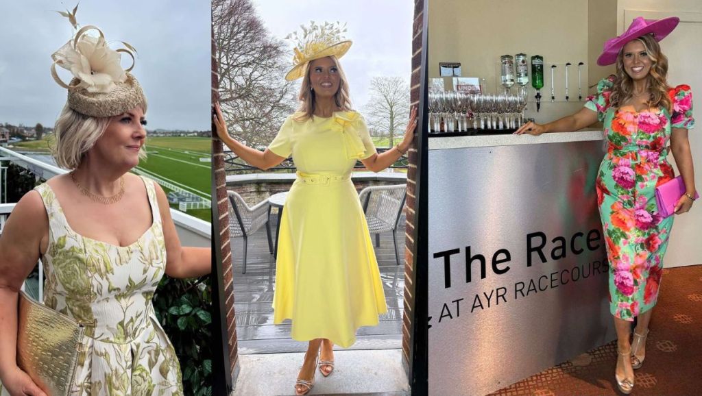 Rule 42 Boutique is one of the Ladies Style Award Partners of the Ayr Grand National and will be giving away £350.00 voucher to spend in their boutique for the winner of the Most Stylish Lady Award! Rule 42 is a Scottish family owned fashion business, specialising in affordable Occasion wear, Party, Prom and Evening Wear. Dresses, accessories and fascinators created by their in-house milliner. Some are also available online at Home | Rule 42 Boutique or visit their two boutiques in Glasgow and Kilmarnock:n 113a Orchard Park Avenue, Glasgow G46 7BW. 01414337638 & 36 Bank Street, Kilmarnock KA1 1HA. On the left is their Sage & Mixed Green Metallic Gold Jacquard Sweetheart A Line Midi Dress £57.00 teamed with their “RIGHT HERE” Gold Metallic Mock Crock Clutch Bag £19.95 and a gold fascinator hired from @queenofhatsglasgow (instagram ). The yellow dress and pink floral dress are available in their Glasgow store and should be available online soon. Again the fascinators are for hire from @queenofhatsglasgow