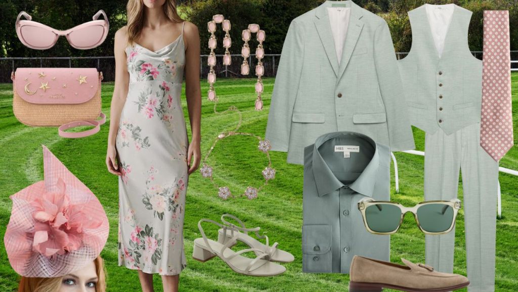 To complement the ladies outfit, choose a pale green suit such as M&S 3 Piece Slim Fit Textured Stretch Suit Suit jacket £90, trousers £50 and waistcoat £50 Keep tonal with their dark sage Easy Iron Cotton Blend Shirt available in regular or slim fit £20.00. Add a touch of pink to match the ladies accessories with their Floral Printed Tie £16.00. Also available in green if you prefer to keep your look tonal. Step in style with their Suede Tassel Loafers in stone. Also available in tan and chocolate. £65.00. Finish off with their D Frame Polarised Sunglasses in green, £20.00 An important must have accessory to give a cool look’
