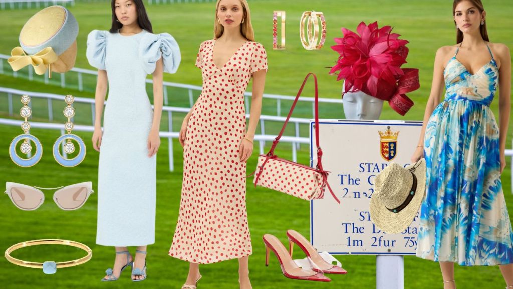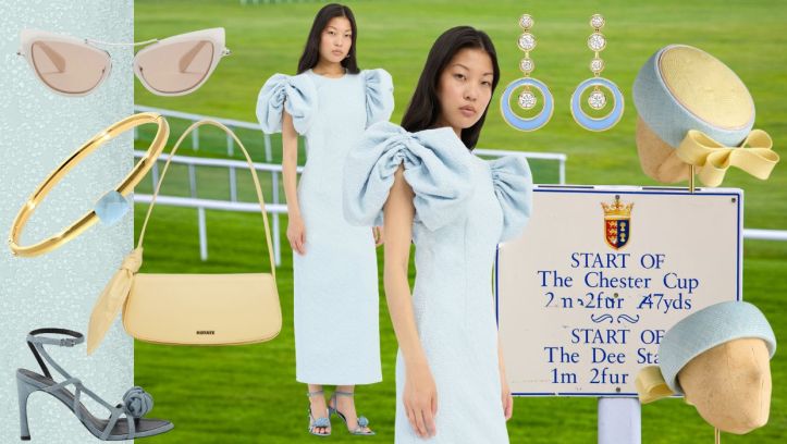 We say…Expect oodles of excitement, fun and of course an excuse to strut your designer label style. This is one event where you can really go to town! Make a statement that is not over the top in Midi Dress by ROTATE Birger Christensen featuring pronounced puff sleeves. In light blue and created from textured jacquard with a floral pattern. 380 Euros. Accessorise with their The Scarf Bag A small compact shoulder bag in pale yellow leather. Featuring a knotted sculptural scarf design placed on one side, 350 Euros. Like the Aintree lady, The Chester lady loves her high heels and is willing to suffer for the fashion stakes. It is the smallest racecourse in the UK so there won’t be long distance walking which is good news to the stiletto wearer. Their Sandal Denim Blue features narrow denim look straps with decorative knotted detail on the front. 420 Euros. Go big on bling, real or paste, but keep it tasteful, and if the budget allows, go Boodles. Their Raindance Diamond Blue Enamel Earrings are set with diamonds and blue enamel in 18 carat yellow gold. The total weight of the diamonds is 0.88 carats (approx). Also available in pink enamel. £4,900.00 Not all your jewellery has to be real Qudo’s Firenze Bangle Gold is made of stainless steel with a light blue faceted crystal solitaire and is an homage to classic elegance that never goes out of fashion. 79.00 Euros. A sunny optimist, the Chester lady expects the sun to shine so sunglasses are essential. Keep light and cool in Max Mara’s white Cat-eye sunglasses £315.00. Your headwear is the finishing touch on a very highly styled ensemble! Hire a hat from Camilla Rose Millinery. Their Dragée captures the elegance of the outfit. A chic pale blue and yellow parasisal headpiece with a pale pink inset band, completed with an elegant structured ivory bow. Hire from £165.00 with a security deposit of 60% of the hire fee.