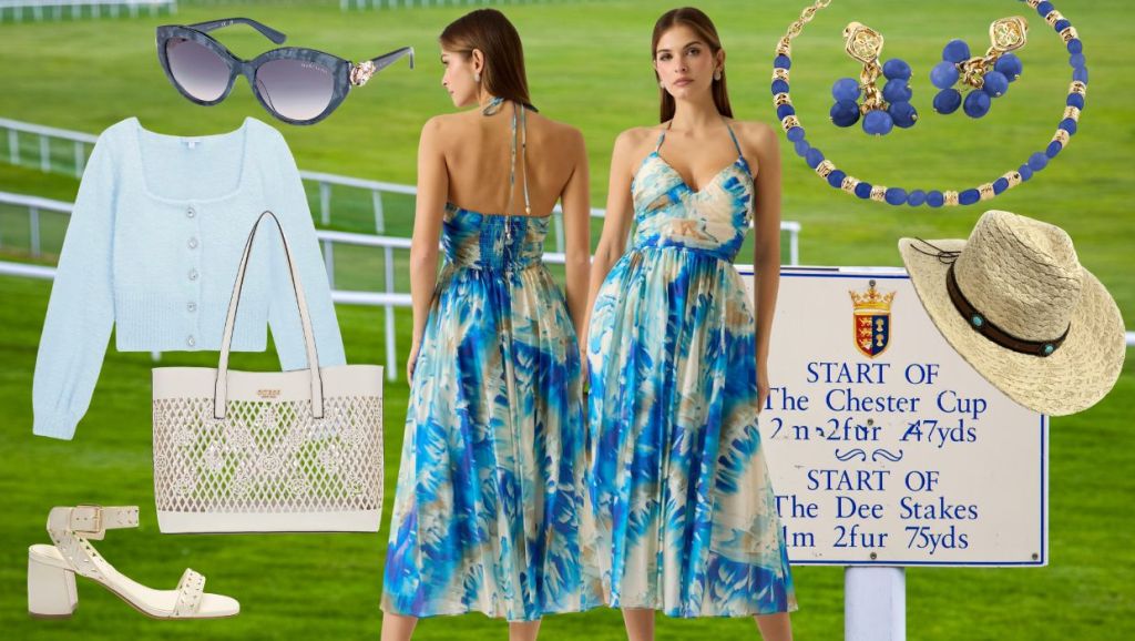 Go summery with MARCIANO by GUESS® Marciano floral print midi dress in multi blue shades A romantic but casual halter neck dress with spaghetti straps, £220.00 Accessorise with GUESS® Olympia earrings £150.00 and matching Olympia necklace £250.00. Add a touch of sparkle wearing GUESS® Marciano cat eye sunglasses in blue with bejewelled hinges. £195.00 Most of the Roodee is an open area, so not great for high heels. GUESS® Gastine Logo Sandals have a mid block heel, an easier style for walking. £95.00. Please note in Roodee, there is only limited cover in the Dee Stand, so be prepared and check the weather beforehand. British weather is unpredictable and the day’s forecast could be rain plus sunny spells so taking a large tote bag or shopper GUESS® Letty Shopper would be a good bet. £135.00. This cream shopper has a separate pouch with a handle that can be used as a handbag. Dims of the shopper are 45x14x30 cm, large enough to pop in GUESS® Jewel buttons cardigan in light blue for when the evening gets chilly (the square neckline will still show off your necklace) £85.00, GUESS® 4G Logo Umbrella in pale pink for the rain £30.00, suntan lotion when the sun starts to shine and a few snacks for a picnic on the grass area in front of Gate area. Please note the grassy Open Course is closed during this festival. There also won’t be much shade, so take a fedora hat or go cowgirl in Cotswold Country Hats’ Summer Straw Cowboy Hat £24.95. Adorned with turquoise blue sea stone with vintage metal surround and metal studs on a faux leather hat band. It is made of 100% paper straw so not recommended for use in the rain ( use a brolly).